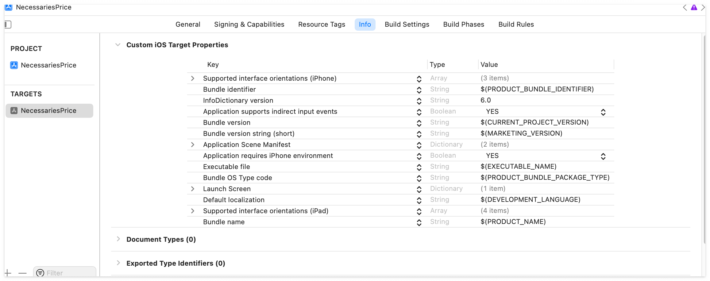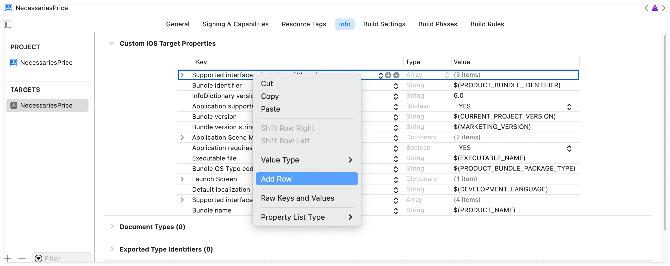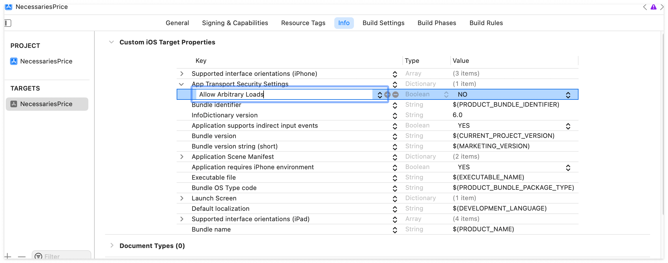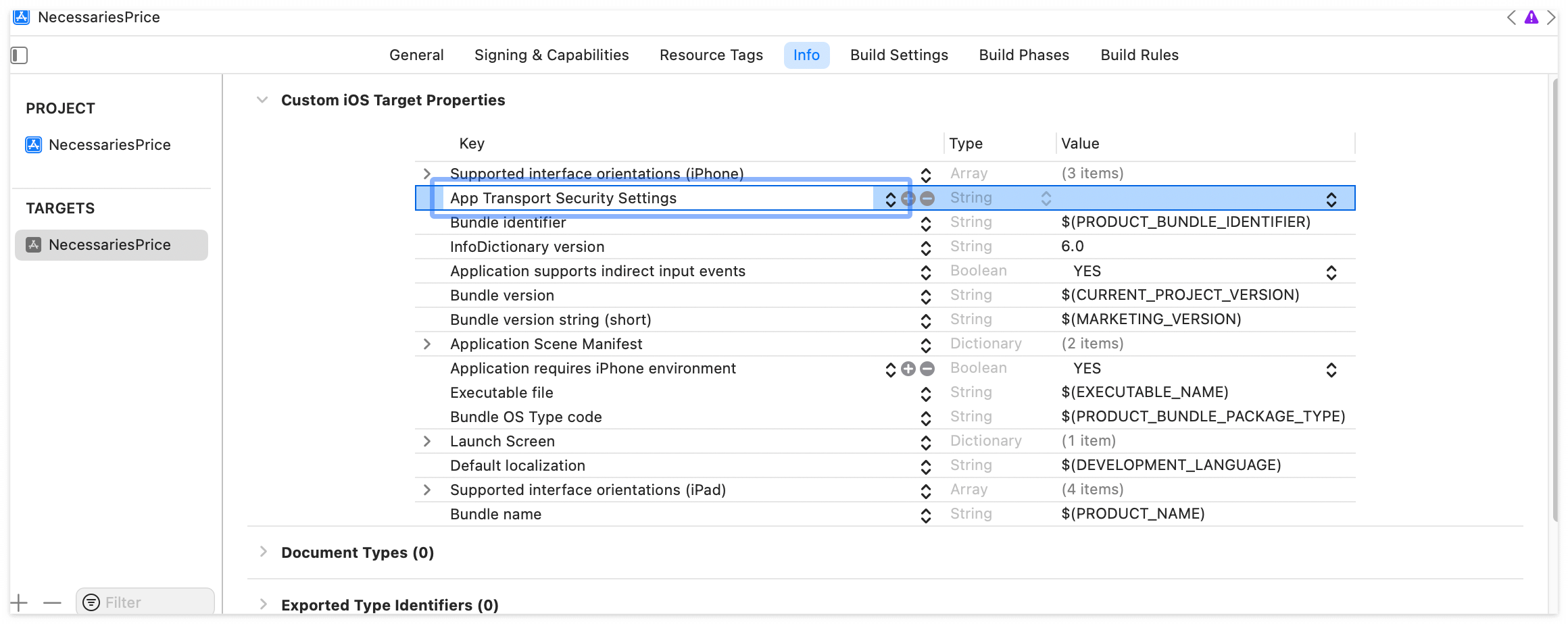 1. 먼저 Info을 확인하면 App Transport Security 설정이 없으므로 추가하기로 한다.