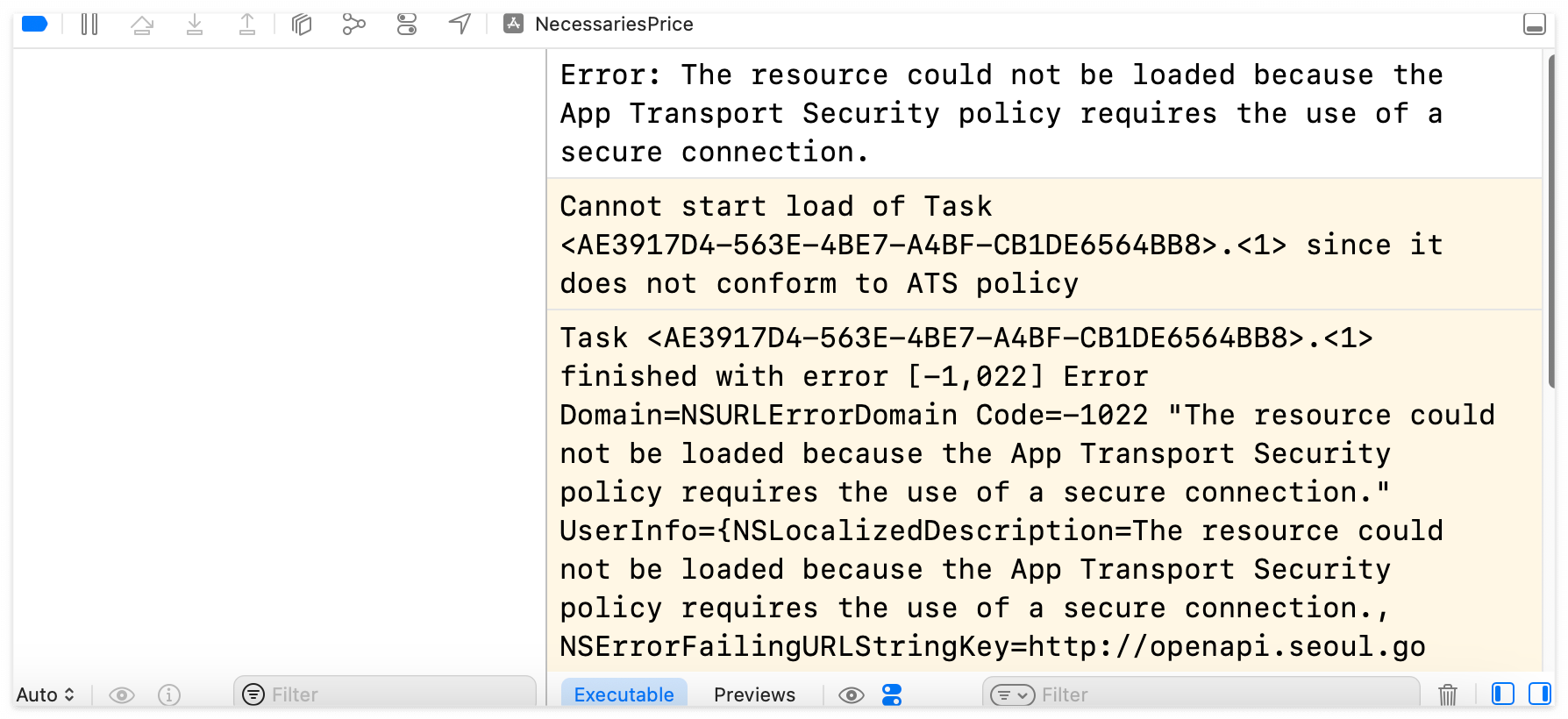 앱 실행 시 "App Transport Security has blocked a cleartext HTTP connection to openapi.seoul.go.kr since it is insecure. Use HTTPS instead or add this domain to Exception Domains in your Info.plist."라는 오류가 발생한다.